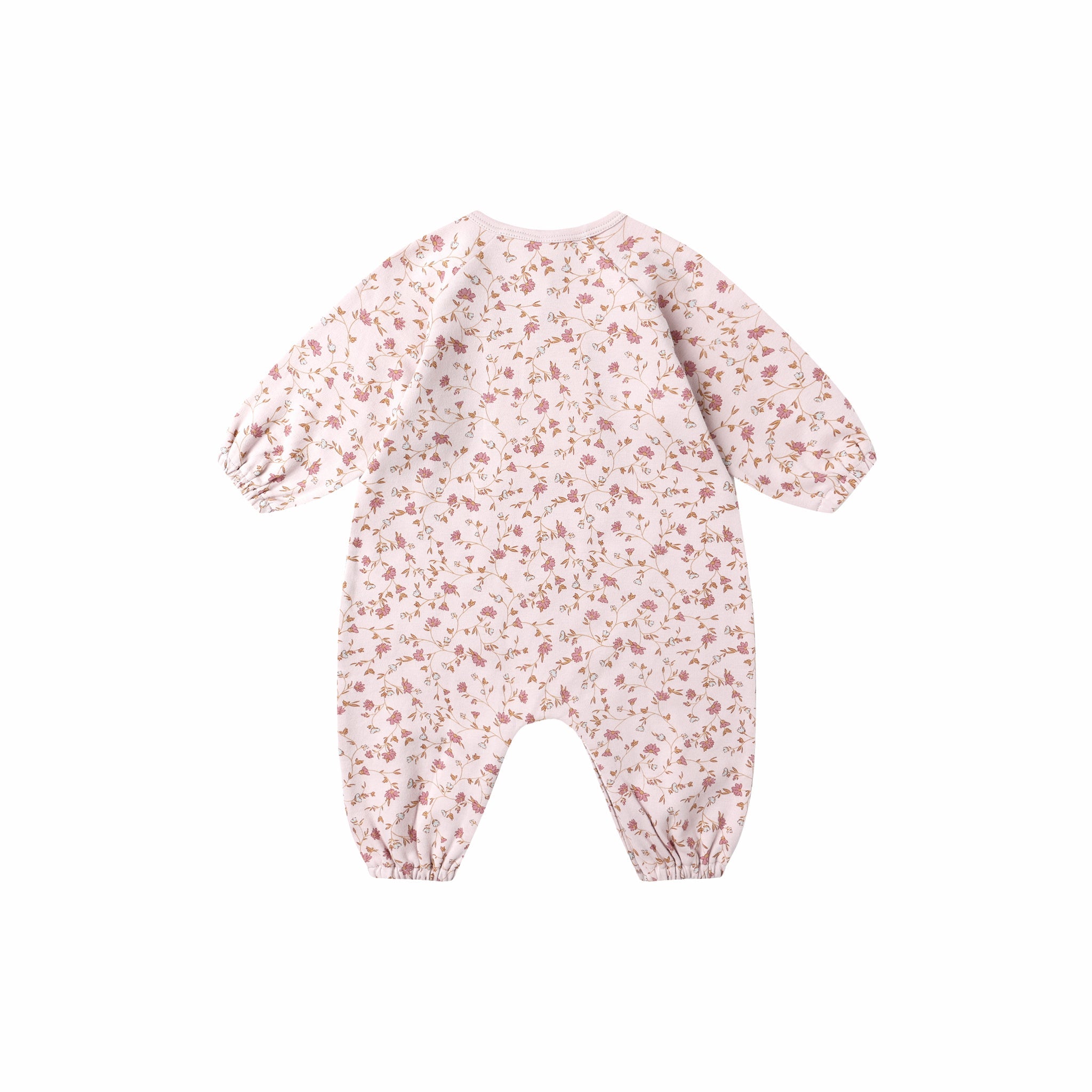 - This long sleeve jumpsuit features a coconut button placket and elasticized sleeve and leg openings for a darling bubbled silhouette. Snaps along the inseam make for easy changes.