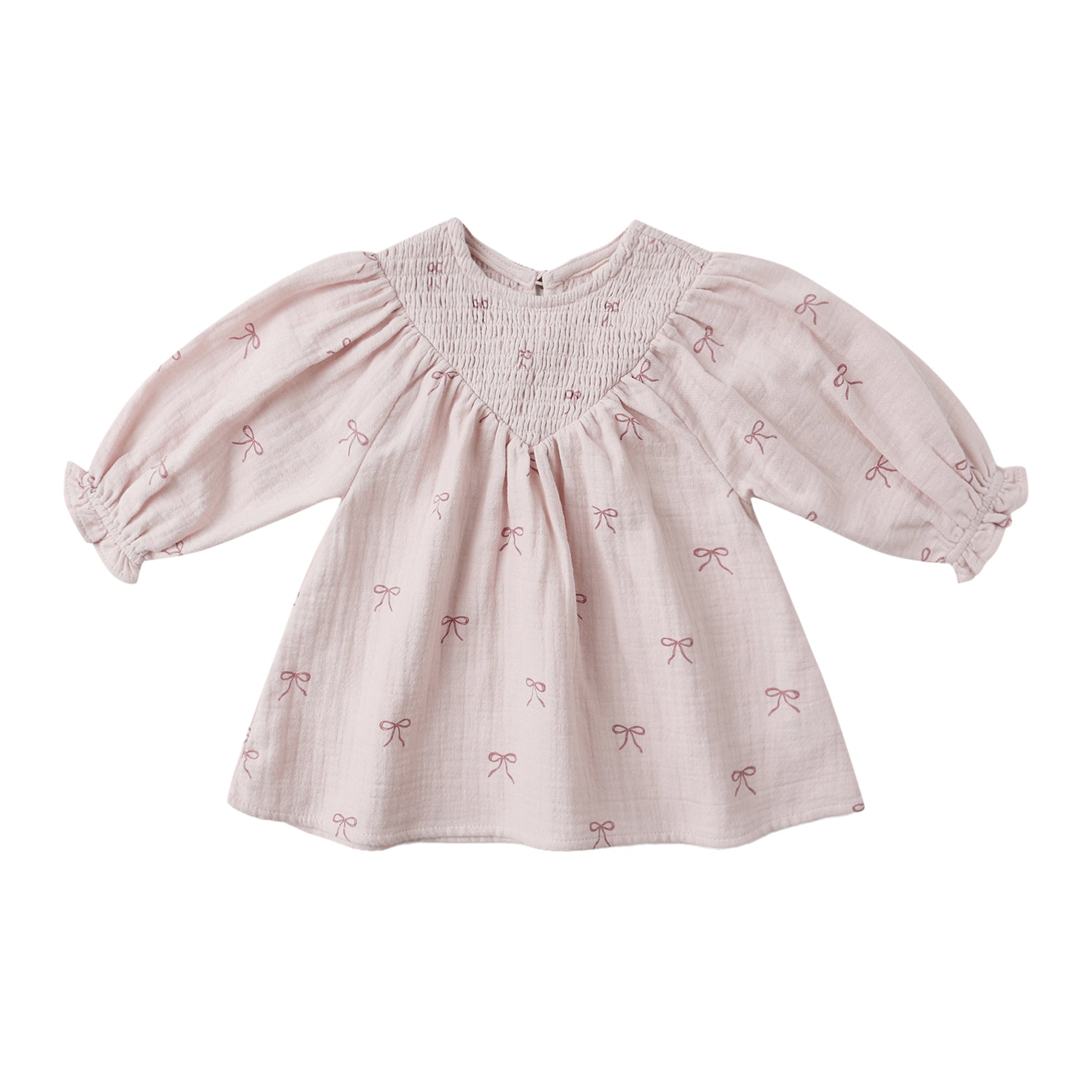 - This sweet long sleeve dress features a v-shaped smocked neckline, ruffle sleeves, and a button back closure for easy changes. Coordinating bloomers included with all sizes.