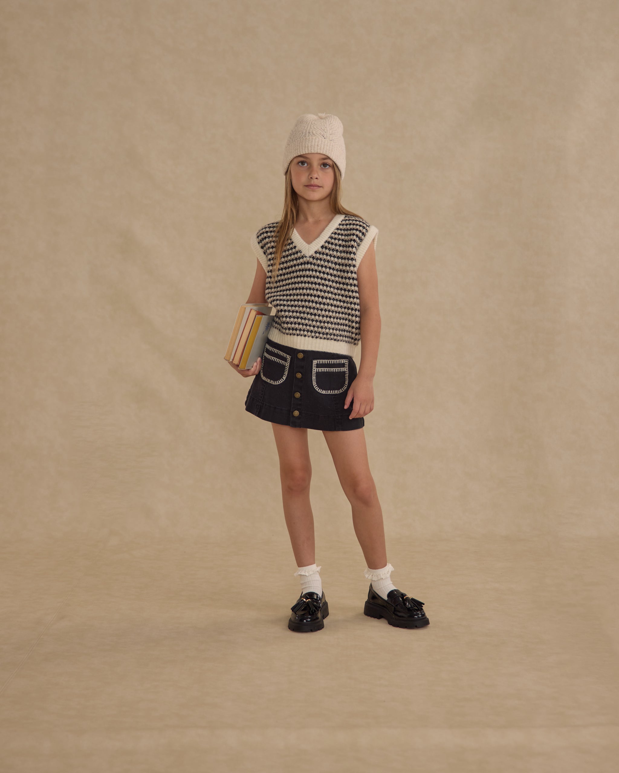 - This versatile denim skirt channels preppy charm with antique brass buttons and front patch pockets accented by contrast embroidered stitching.