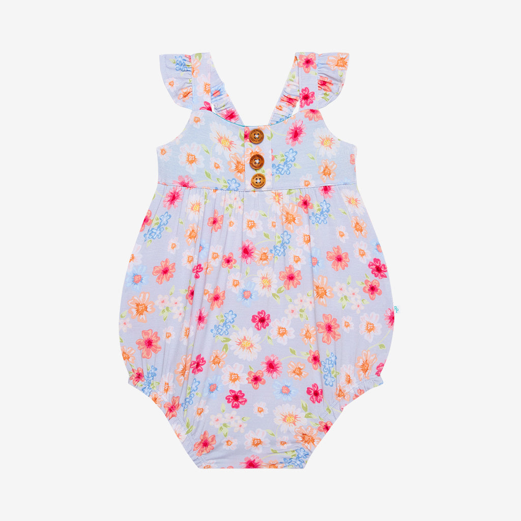 The bubble romper with ruffled cap sleeves in a signature design! Comes with inseam snaps for an easy diaper change and is made from our coveted Päpook® viscose from bamboo for extra comfort and all-day wear.