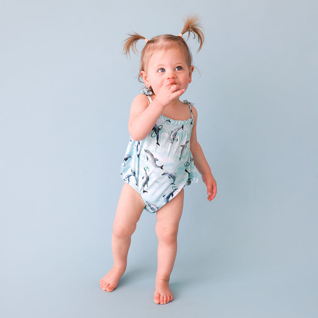 Spaghetti strap bubble rompers are the perfect lightweight summer outfit! Päpook® viscose from bamboo is buttery soft, breathable, and oh so cute!