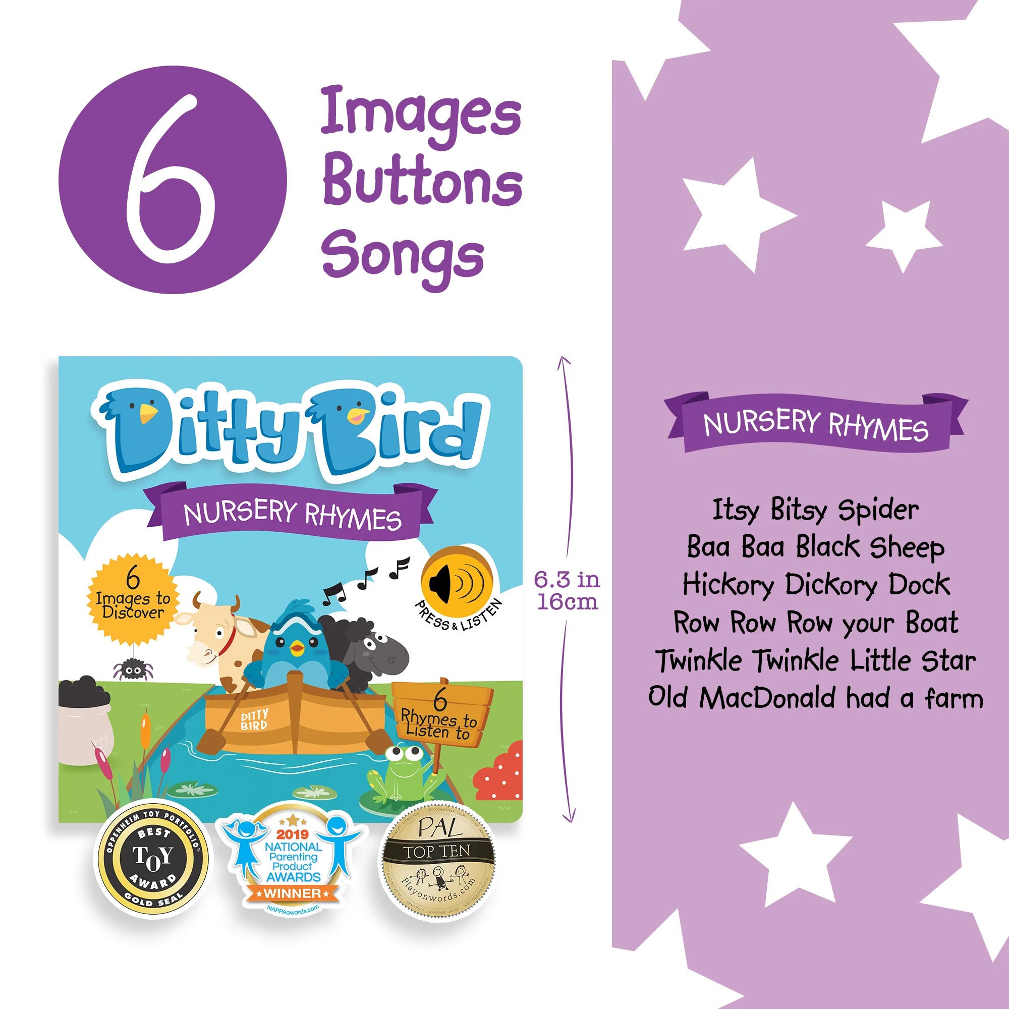 Ditty Bird’s second journey takes us to the land of much loved Nursery Rhymes. Just find and touch the ‘sound dot’ on each page to listen to all your favorite rhymes sung by children. Your little ones will become familiar with timeless rhymes every child should know.
