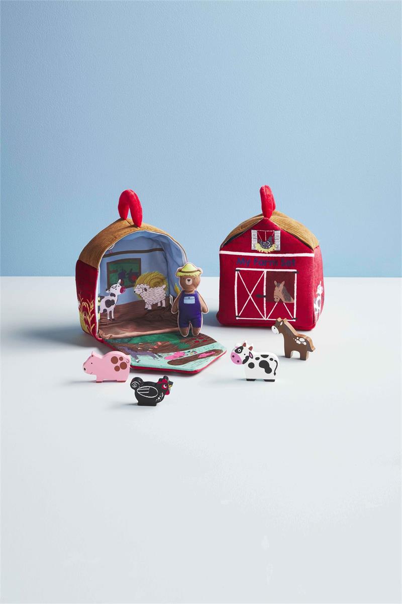 - Plush barn includes dimensional bear farmer and wooden pig, cow, horse and chicken.