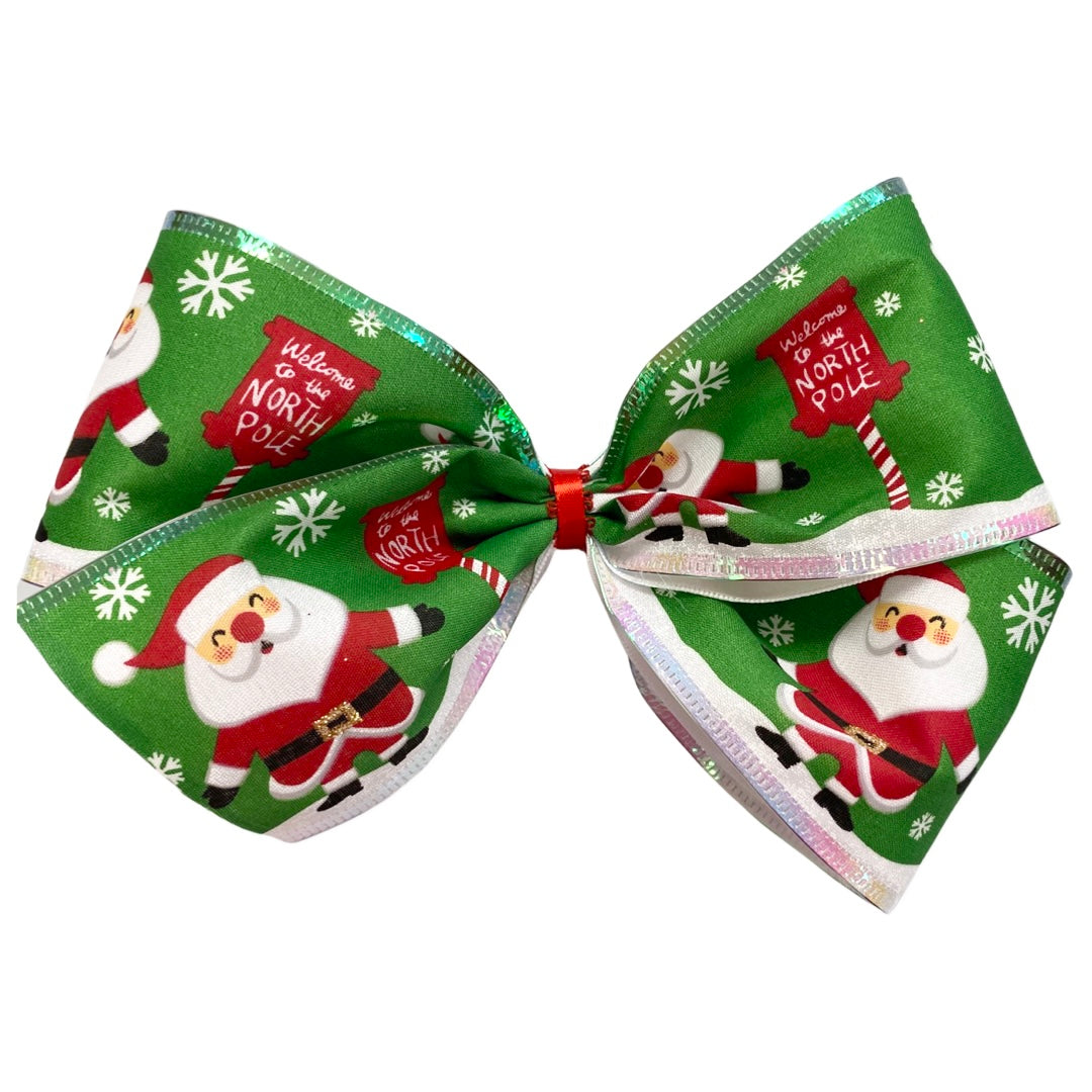 - This Basically Bows & Bowties handcrafted hair bow is made with 2 1/4" white satin base, a Santa printed wire edge top layer and accented with a solid flat knot in the center of the bow.