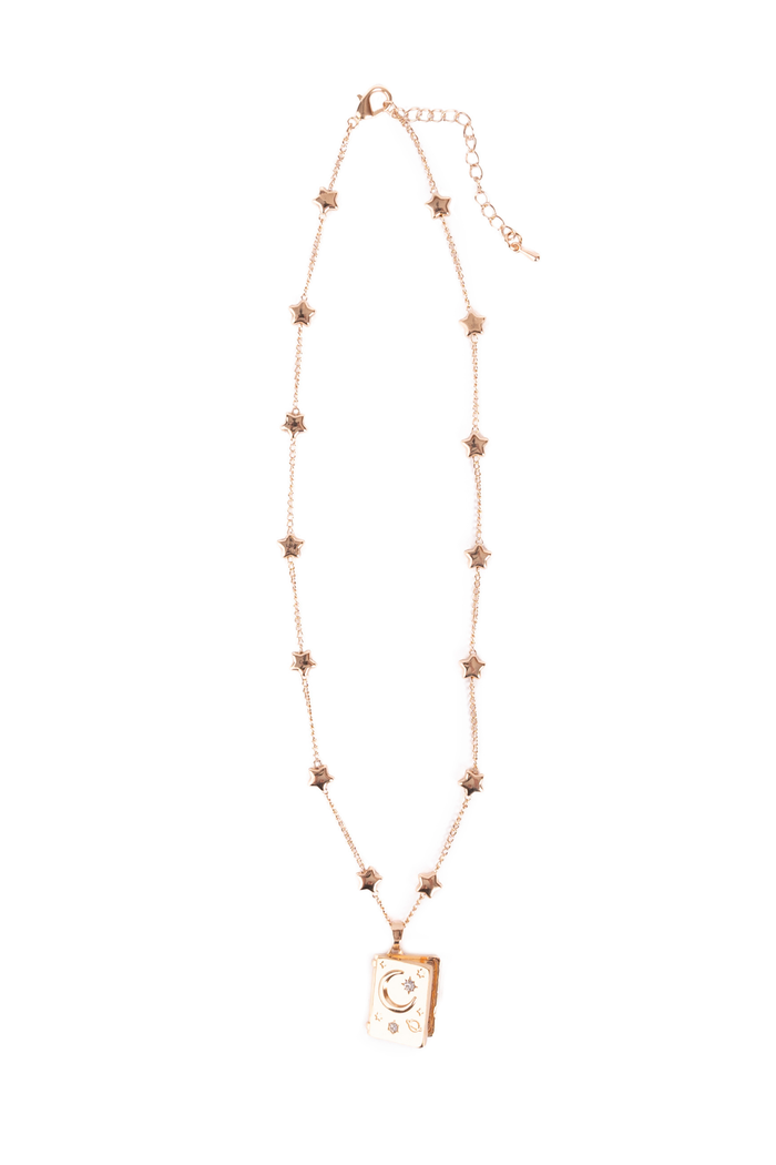 - Our It Must Be in the Stars Locket is a captivating gold necklace that features delicate star charms along the chain and a charming book-shaped pendant adorned with a crescent moon!
