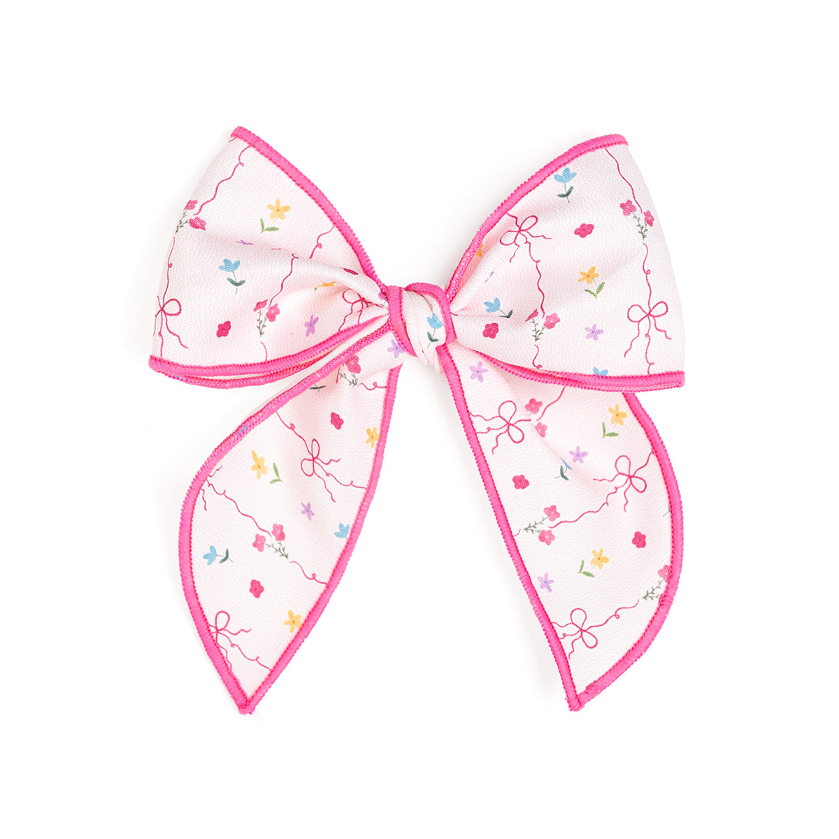 • Soft pink bow with a multicolor floral and bow print pattern