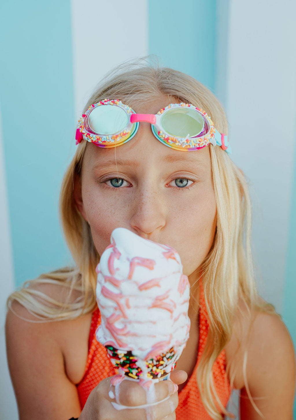 - Look S W E E T while making a splash in the Bling2o sprinkle coated swim goggle, faux rainbow sprinkle coated lens with sweet silicone sliders on the strap.