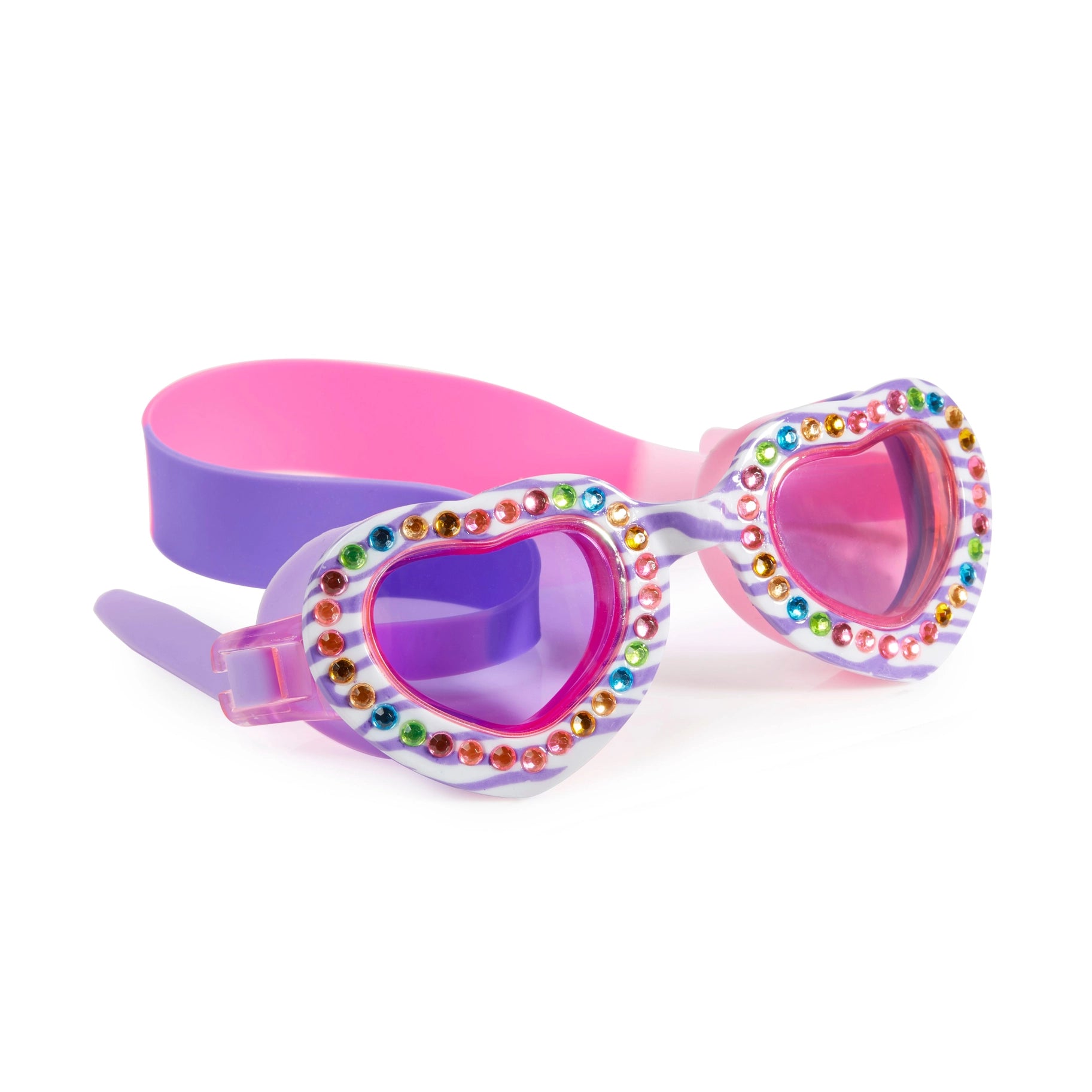 - These heart-shaped swim goggles feature an iridescent zebra pattern and a full set of rhinestones that will make your young swimmer shine in the pool.