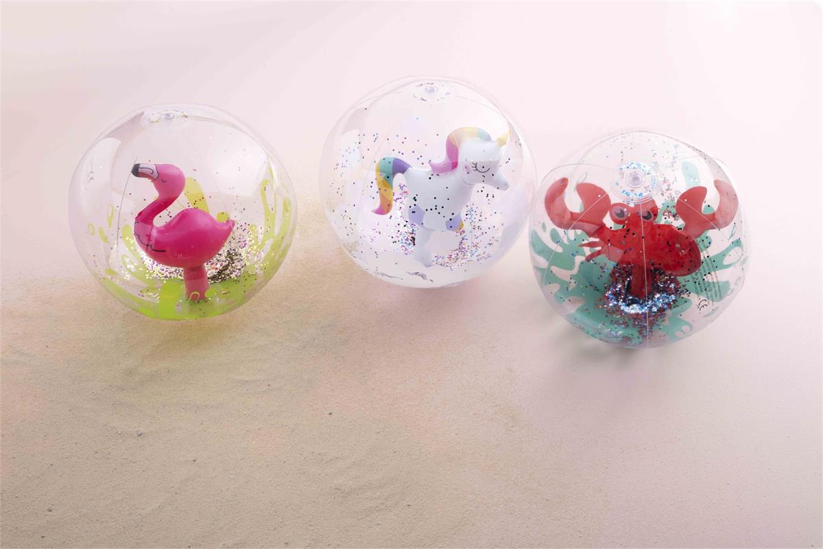 • Glitter filled transparent beach ball with fun inflatable character inside.