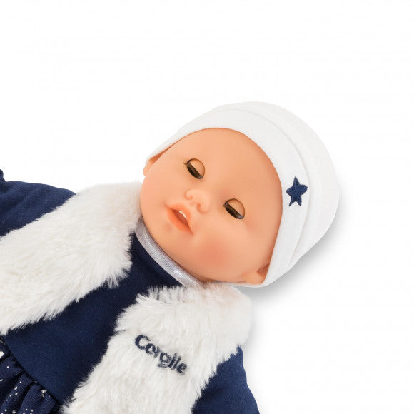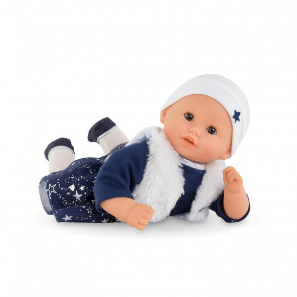 Bébé Calin Marguerite Starlit Night is a 12-inch baby doll that is perfectly sized to be cradled in a young child's arms and is ideal for hugging and cuddling.
