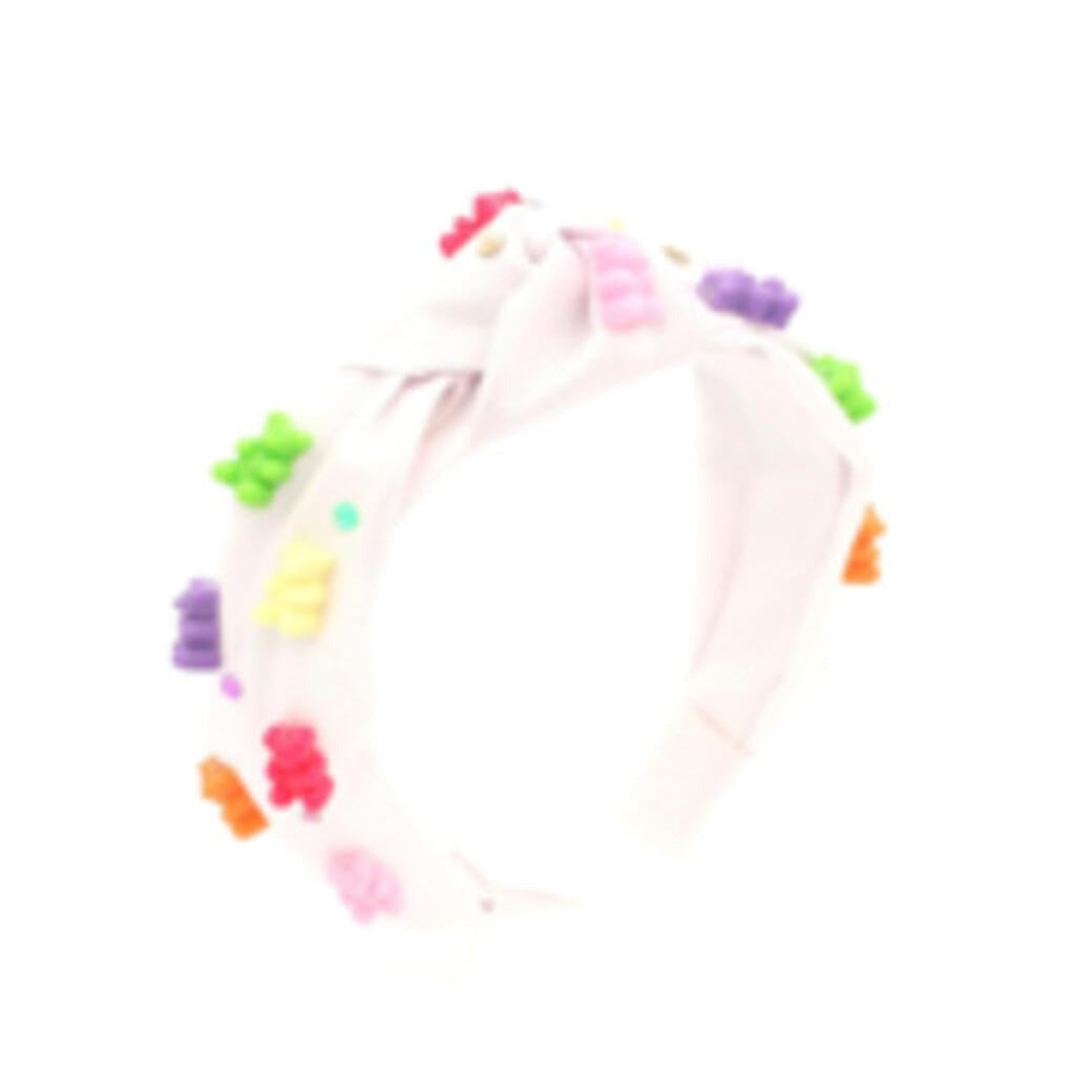 - Metallic knot headband accented with crystals and neon gummy bear charms.