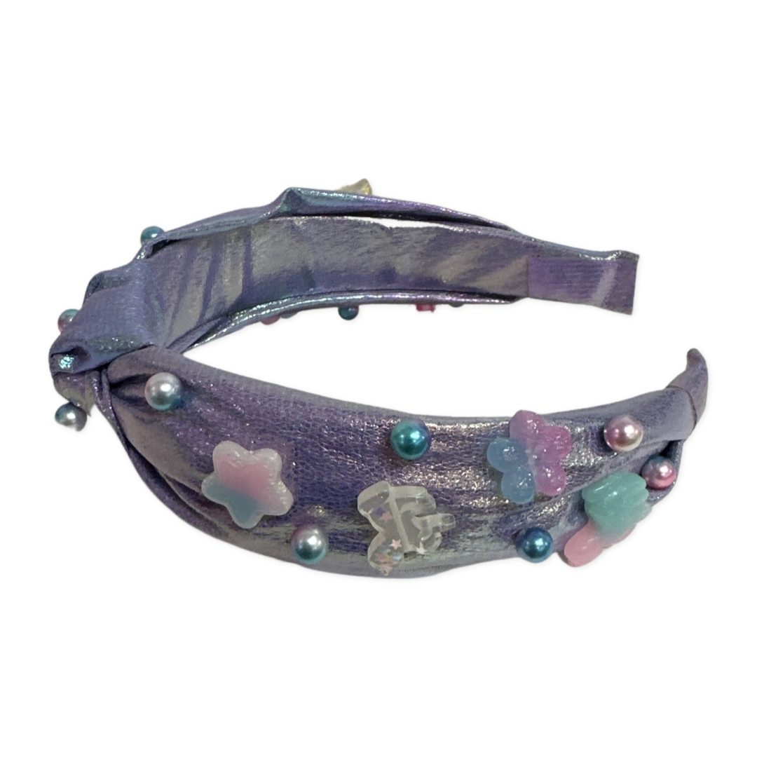- Metallic knot headband accented with pearls and various unicorn and star charms.