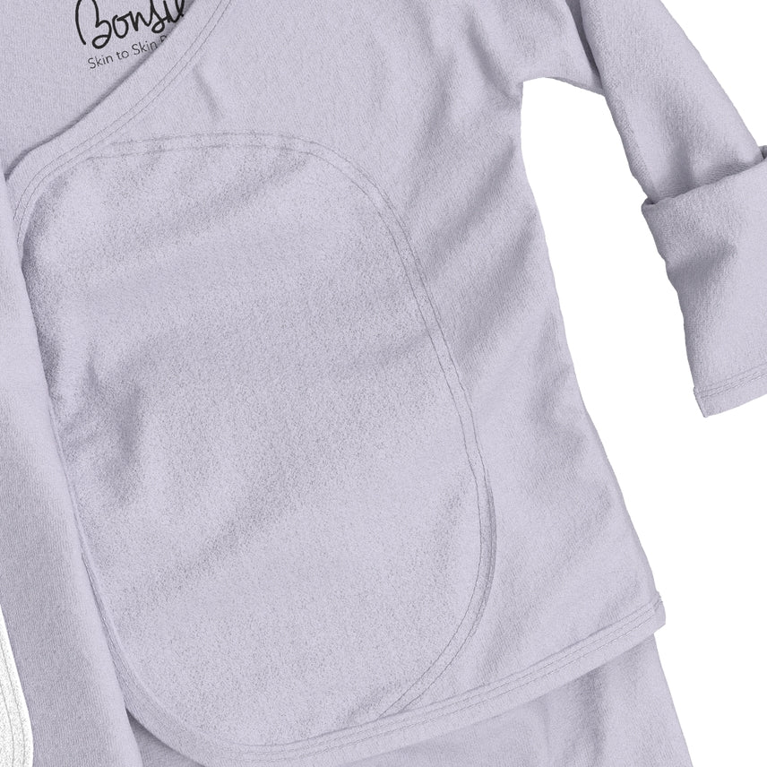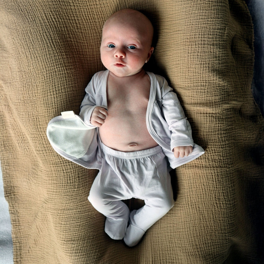 - Once the two flaps are open, the baby's chest and belly are fully exposed for skin to skin connection. The elastic waistband allows for easy dressing and (as easy as they can get) diaper changes.