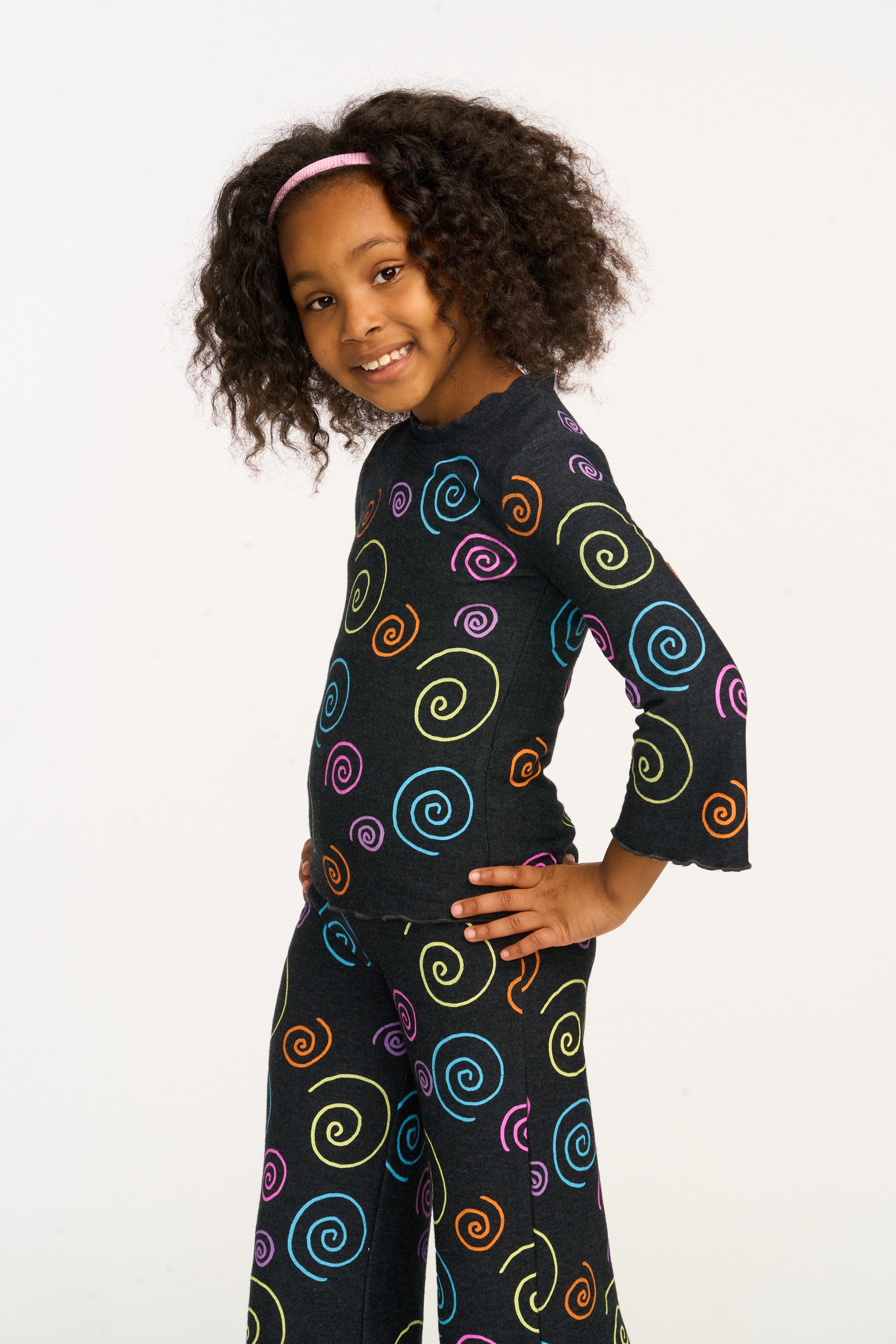 Fancy up your daughter's wardrobe with this Rainbow Swirl Ruffle Neck Long Sleeve! She'll love the cool, cozy knit poly-blend fabric while you'll adore the on-trend ruffle neck and bell sleeves.