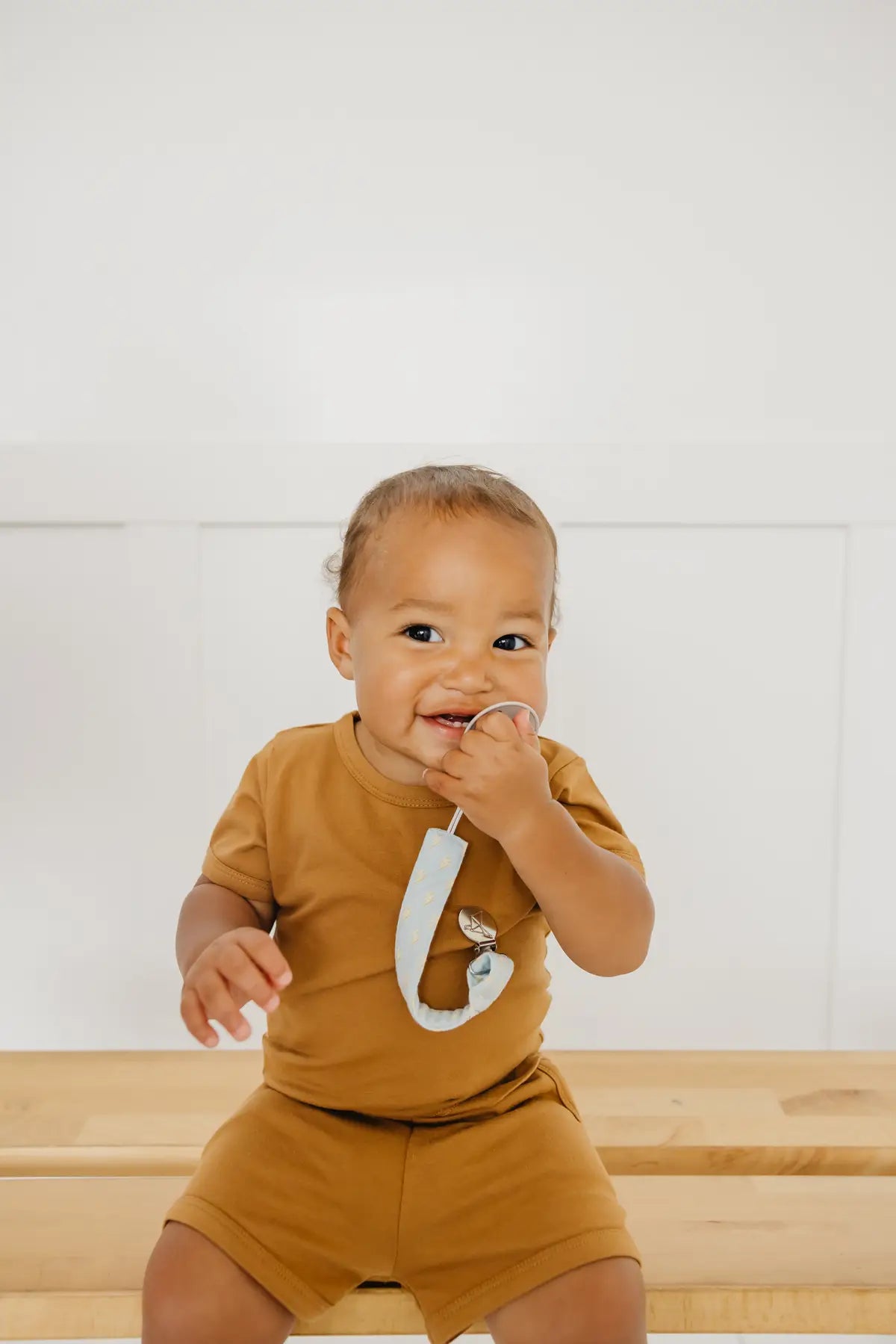 Offering the ultimate blend of fashion and function, our unique Binky Clip features a premium knit strap lined with absorbent fleece to help soak up drool. Simply attach baby's pacifier or teether to one end, then fasten the clip to clothing, blankets or baby gear. Oh, and by the way our set includes three Binky Clips to keep with you wherever you go - no more floor drops or pacifier pick-ups!