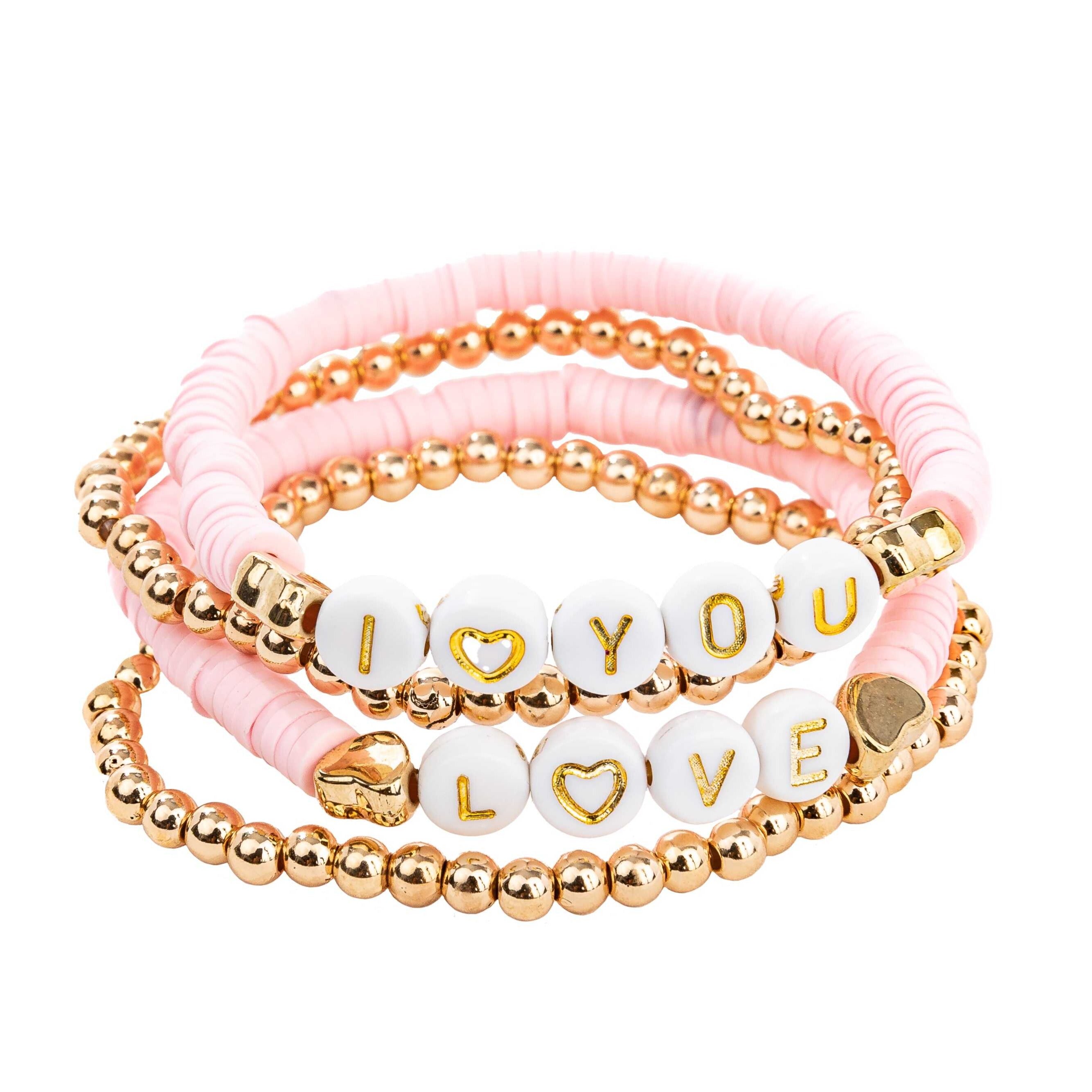 - This 4pc bracelet set is all about the love! 4 separate strands of pink and gold bliss are perfect for stacking or sharing with friends.