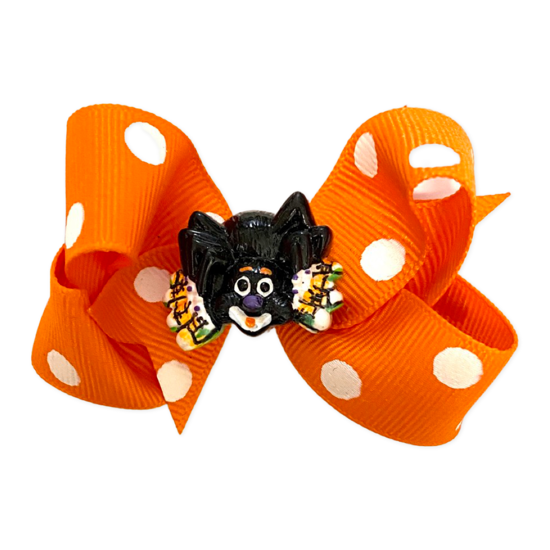 - The super cute and oh so sweet Basically Bows & Bowties handcrafted, made in the USA, hair bow is made with orange polka dot ribbon and accented with a spider in the center of the bow.