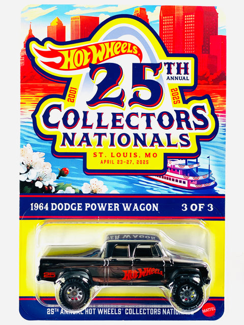 • 1964 Dodge Power Wagon: Detailed headlights, taillights and trim; Hot Wheels logo and "Nationals 25th ANNIVERSARY" on sides; "DODGE" on sides and tailgate; matte black roof and stripes on sides & hood; 25th Annual Collectors Convention wording on tailgate; "25 YEARS" on white front & rear license plates