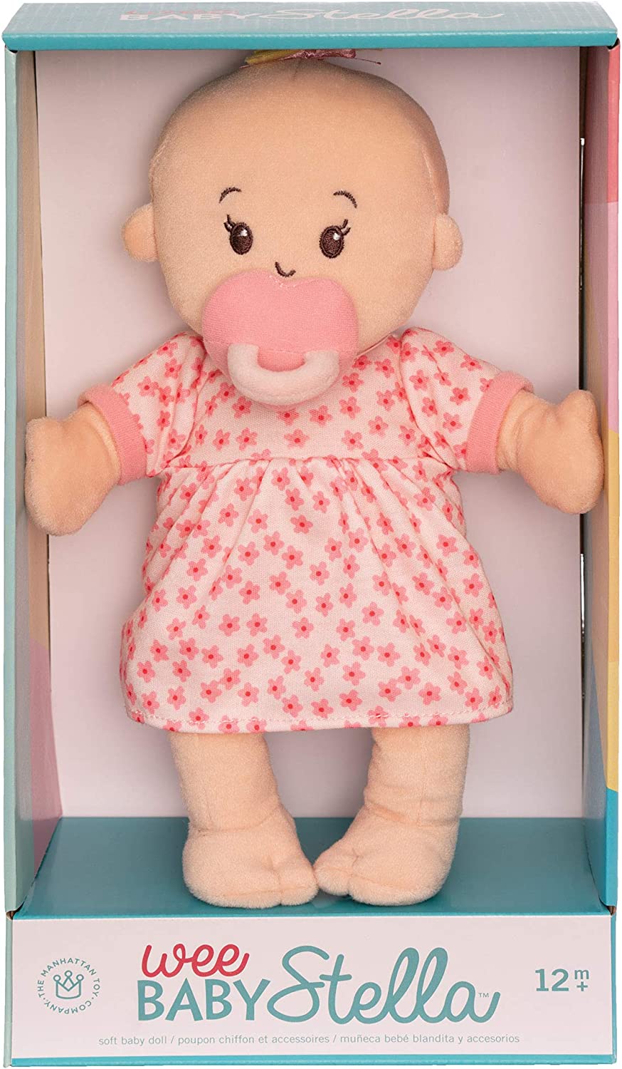 Wee Baby Stella is a perfect first baby doll. Soft baby doll play fosters nurturing skills through role play. The 12 inch peach Wee Baby Stella doll is completely soft and beautifully crafted with life-like details such as a belly button and perfectly plump tummy and comes with a magnetic pacifier.