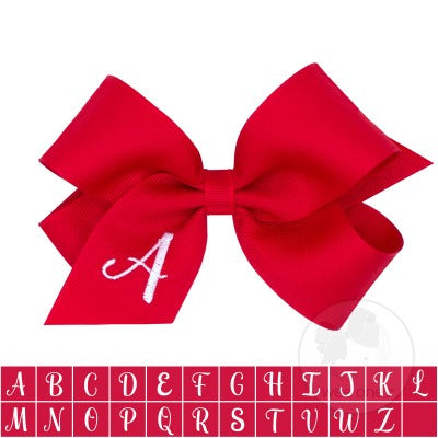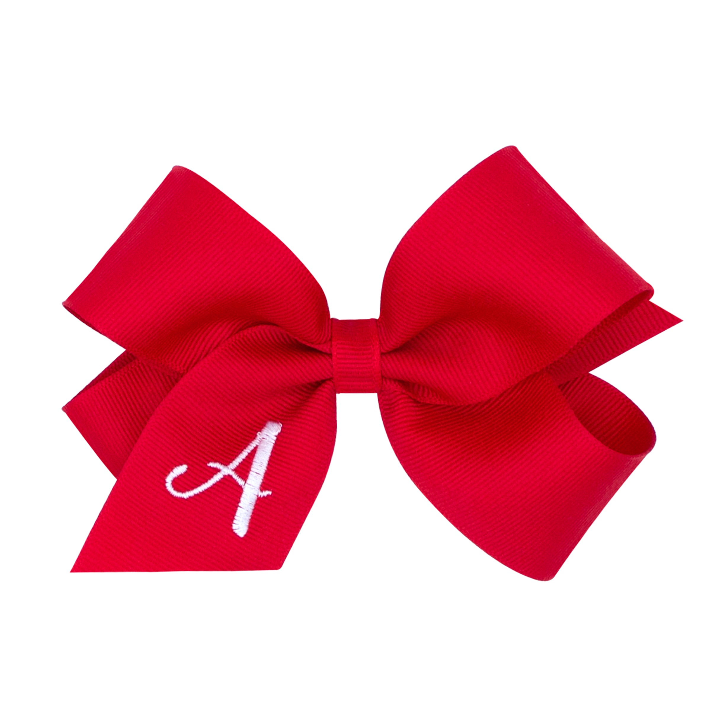 • This handcrafted hair bow is made with 1 1/2" red grosgrain ribbon accented with a white monogram letter on the tail of the bow.