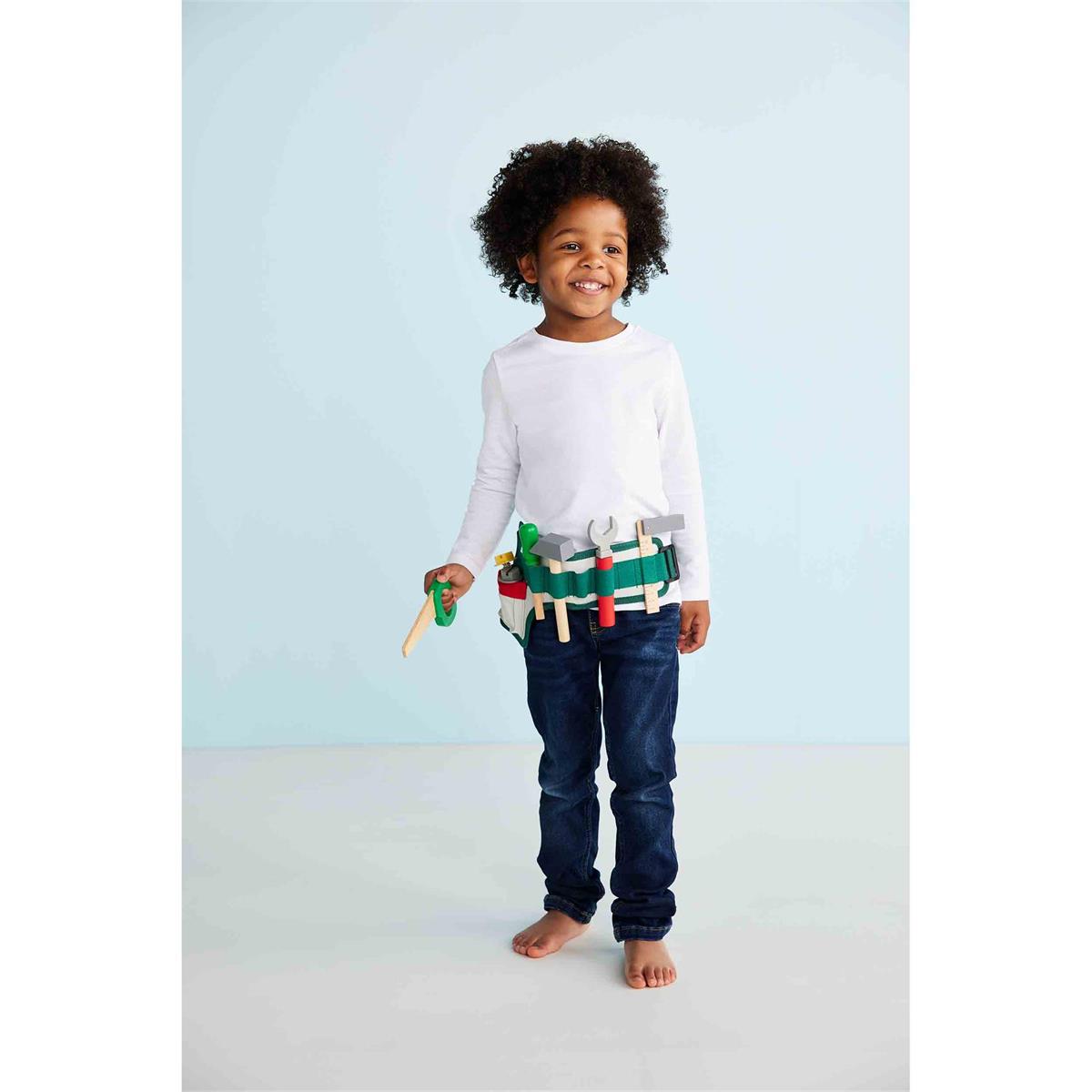 - Canvas belt holds wooden saw, wrench, screwdriver, mallet, ruler and two screws.
