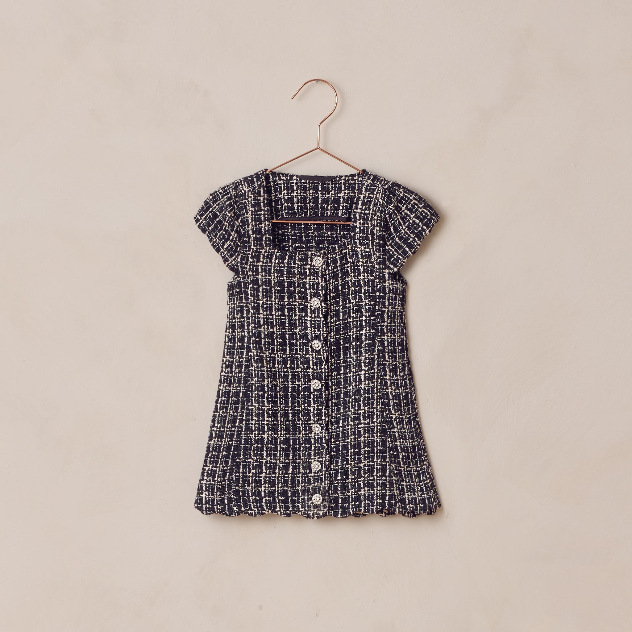 • Our Gabrielle Dress brings timeless elegance with its tailored tweed fabric and classic silhouette. Featuring a curved neckline, side zipper, short sleeves, and decorative floral buttons, this charming style is finished with scalloped edges along the placket and hem for an extra-special touch.