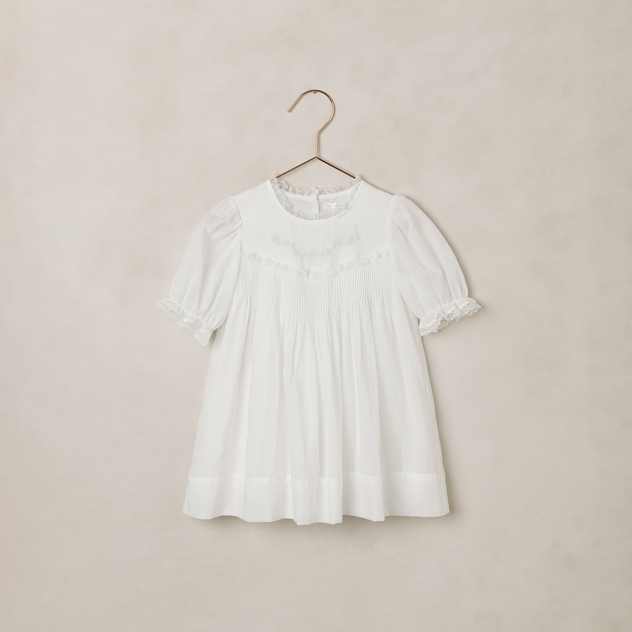 • This vintage-inspired dress features soft lightweight cotton, pin tuck bodice with lace and embroidery detail, puff sleeves and button back closure.