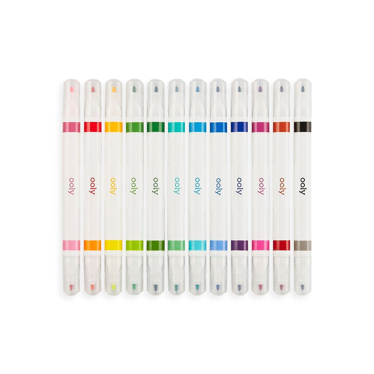 - Dual-tipped colored markers 12 markers with 24 colors Point tips Oval shaped barrels won't roll away