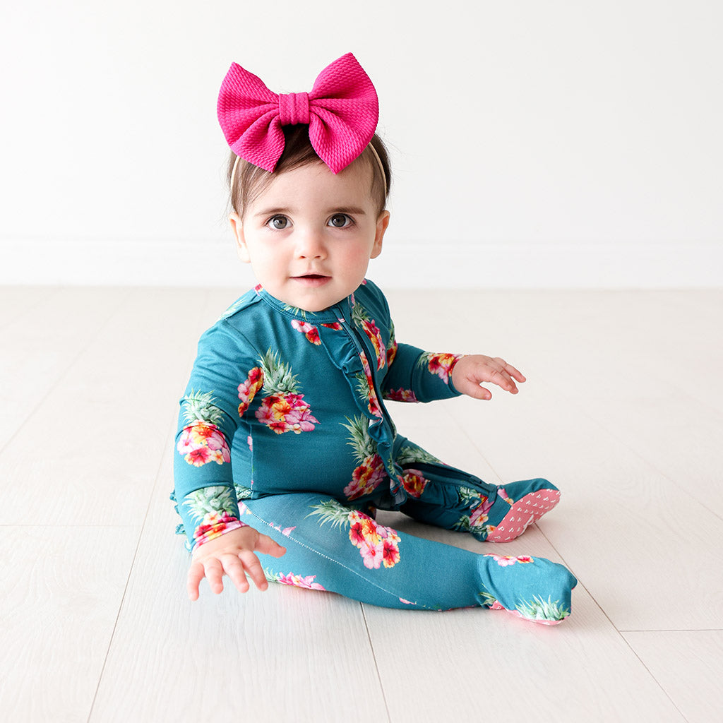 Viscose from bamboo one-piece footie coverall with reversible zipper opening. New reversible zippers are perfect for late-night changes and the ease of not undressing your peanut. Zip up or down for a quick change. Signature Posh Peanut Footie grips, elastic backing on footies for a snug fit and fold-over mittens in sizes NB and 0-3M. Buttery soft jammies so cute you can wear them out!
