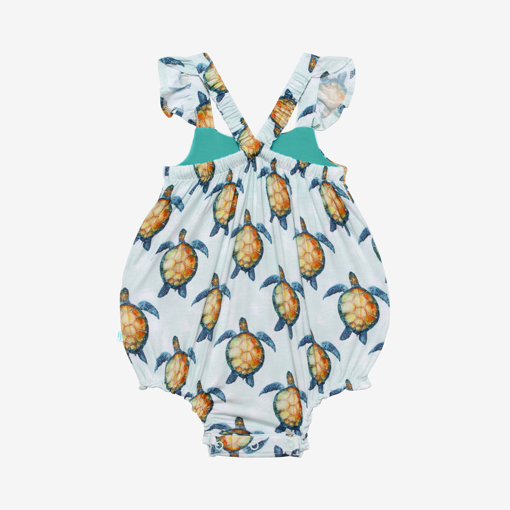 The bubble romper with ruffled cap sleeves in a signature design! Comes with inseam snaps for an easy diaper change and is made from our coveted Päpook® viscose from bamboo for extra comfort and all-day wear.