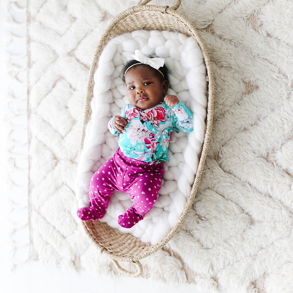 Kimono one-piece bodysuit with matching footed jogger in coveted Viscose from Bamboo. Wrap your peanut in style with fold-over kimono style with tie closure. Kimono style is the perfect comfort outfit with smart wrap design and nothing pulled over your peanut's head. Fold-over mittens are added for extra protection from self-scratching and extra warmth. Stretchy bamboo is buttery soft and snuggly for newborns.