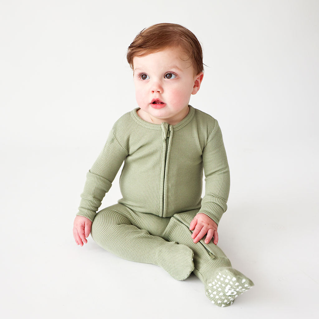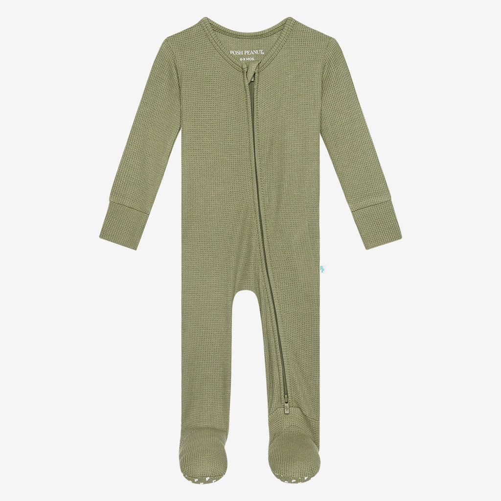 Viscose from bamboo one-piece footie with zipper opening. Signature Posh Peanut Footie grips, elastic backing on footies for a snug fit and fold-over mittens in sizes NB and 0-3M. Buttery soft jammies so cute you can wear them out!