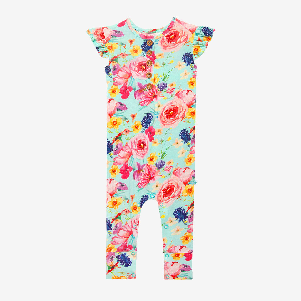 Posh Peanut ruffled cap sleeve romper with ruffle detail on back and snaps for easy diaper changes. Made from our coveted lux viscose from bamboo for extra comfort and all-day wear!