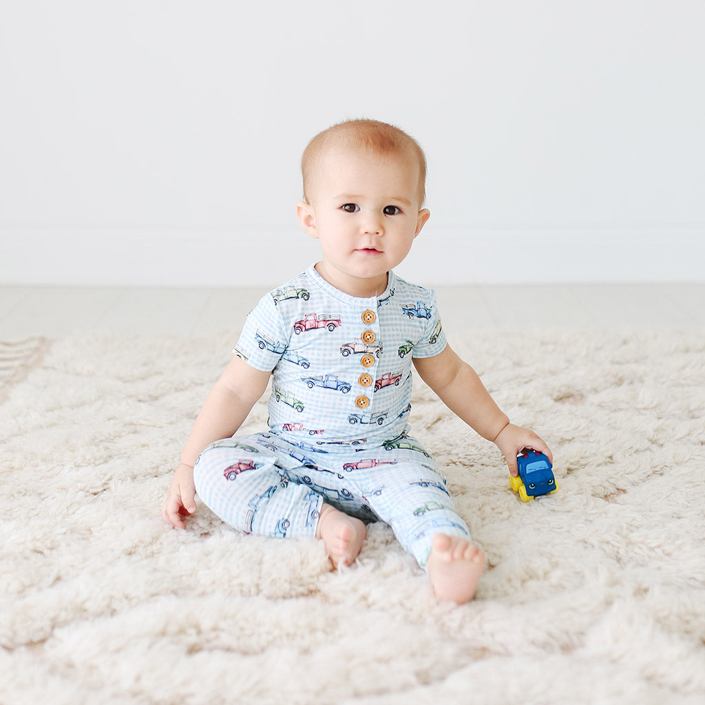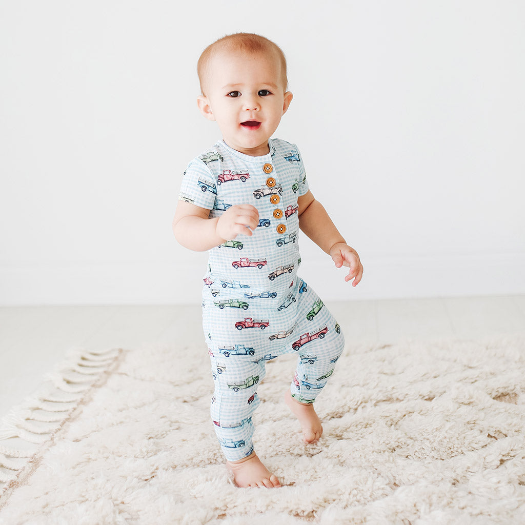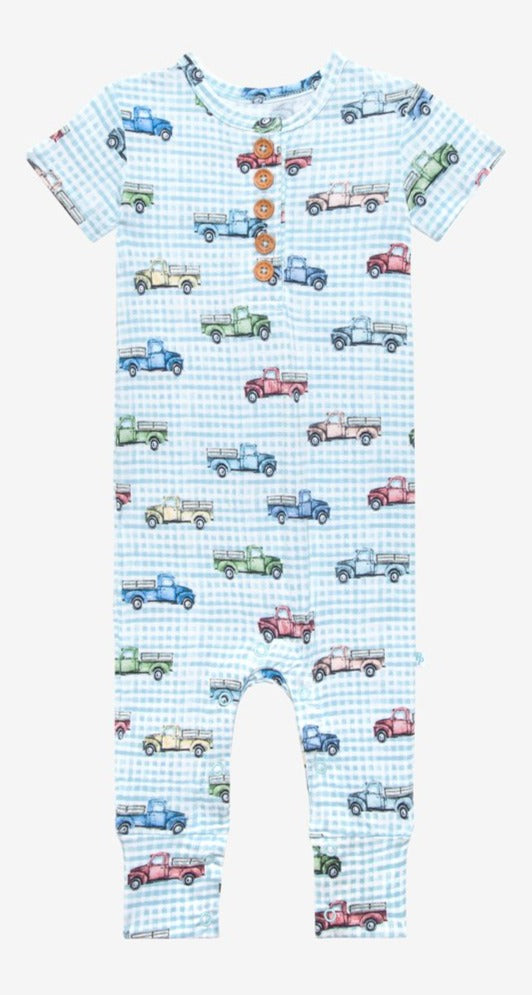 The Posh Peanut short sleeve romper with snaps for easy diaper changes. Made from coveted lux viscose from bamboo for extra comfort and all-day wear!